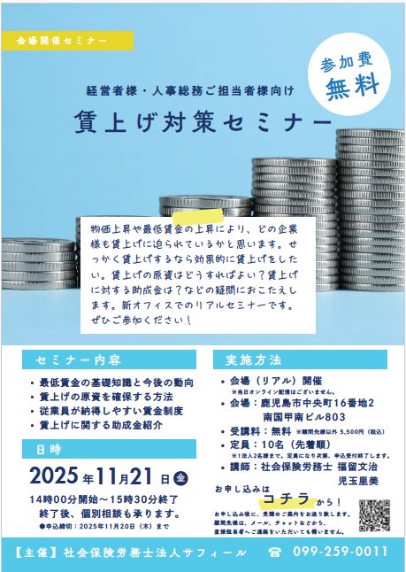 経営者様・人事総務ご担当者様向けの「賃上げ対策セミナー」を、令和7年11月21日(金)14:00~開催いたします。