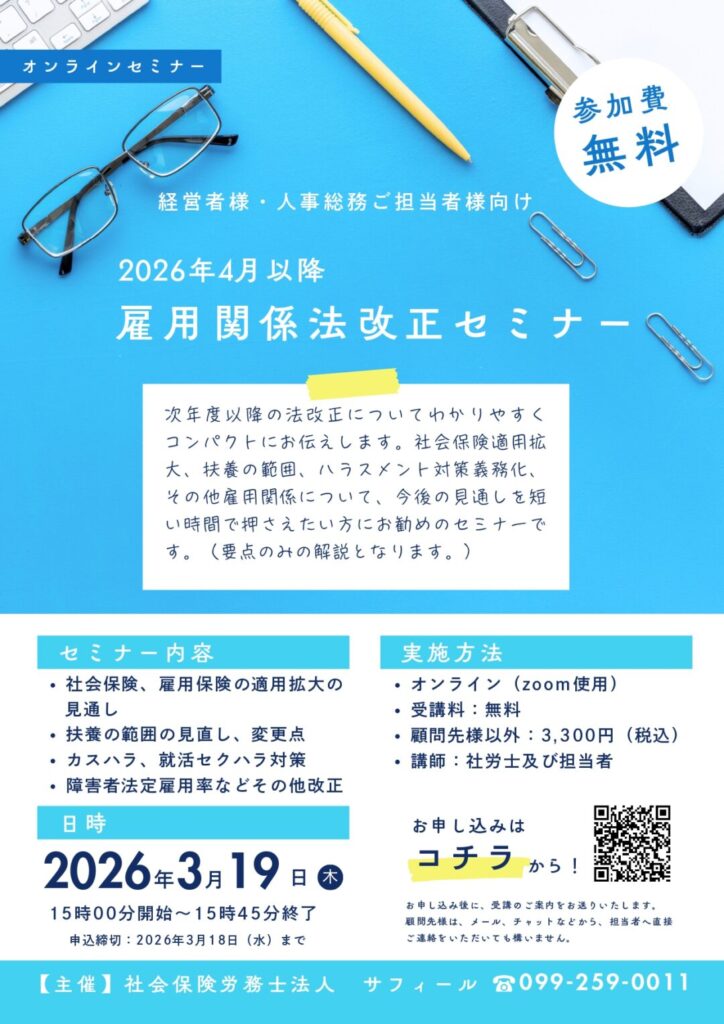 2026年4月以降「雇用関係法改正セミナー」を、令和8年3月19日(木)15:00~オンラインにて開催いたします。